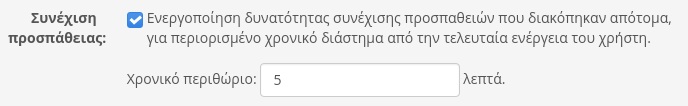 Θα πρέπει να σημειωθεί ότι η επιλογή αυτή δεν επηρεάζει τη δυνατότητα συνέχισης της προσπάθειας σε περίπτωση μη κανονικής διακοπής της άσκησης (π.χ. διακοπή ρεύματος, δικτύου, αστοχία του υπολογιστή). Η ανεξάρτητη αυτή δυνατότητα είναι αυτόματα ενεργή κατά τη δημιουργία νέας άσκησης, και ελέγχεται από την παρακάτω επιλογή: