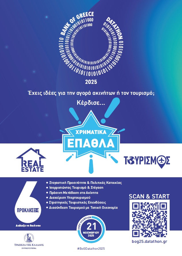 Η Τράπεζα της Ελλάδος σε συνεργασία με τον Οργανισμό Ανοιχτών Τεχνολογιών (ΕΕΛ/ΛΑΚ) και την υποστήριξη του GR digiGOV-innoHUB, διοργανώνει τον 2ο Εθνικό Διαγωνισμό Εφαρμογών Ανοικτών Δεδομένων Datathon 2025.