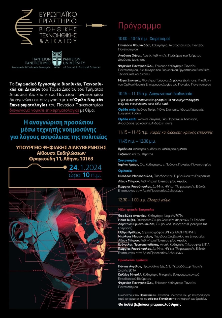 Το Ευρωπαϊκό Εργαστήριο Βιοηθικής, Τεχνοηθικής και Δικαίου του Τομέα Δικαίου του Τμήματος Δημόσιας Διοίκησης του Παντείου Πανεπιστημίου, διοργανώνει σε συνεργασία με τον Όμιλο Νομικής Επιχειρηματολογίας του Παντείου Πανεπιστημίου, διαγωνισμό νομικής επιχειρηματολογίας με θέμα: