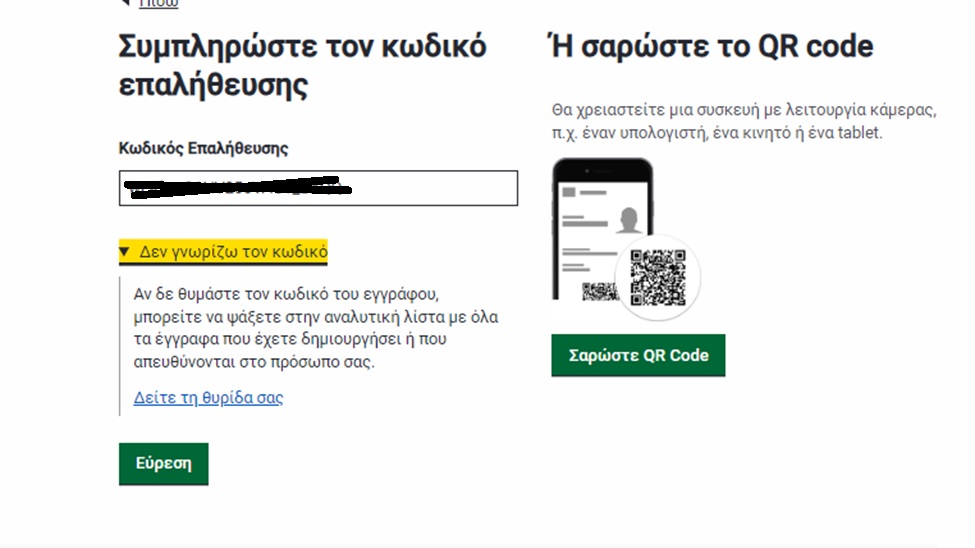 Ο κωδικός του εγγράφου ή κωδικός επαλήθευσης και το QR code, αφορούν στη χρήση του ελέγχου εγκυρότητας του πιστοποιητικού σπουδών. Επιλέγοντας την ενέργεια «Έλεγχος εγκυρότητας. Επαληθεύστε την εγκυρότητα ενός πιστοποιητικού σπουδών» και ή συμπληρώνετε τον κωδικό επαλήθευσης στο πλαίσιο ή σαρώνετε το QR code.